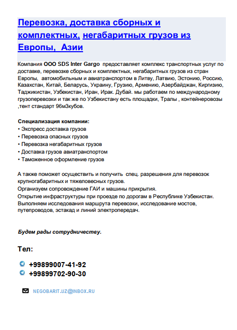 грузоперевозки и так же по Узбекистану есть площадки, Тралы , контейнеровозы