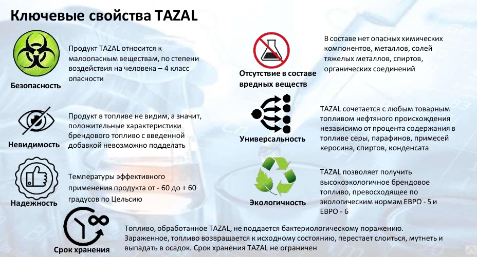 Добавка безопасна для автомобилей. Случайная многократная передозировка тоже не способна навредить технике. «TAZAL» не изменяет физический, химический и фракционный состав топлива. Продукт продлевает ресурс двигателям внутреннего сгорания. Так же продукт не взаимодействует с резиновыми шлангами, прокладками и другими частями автомобиля.