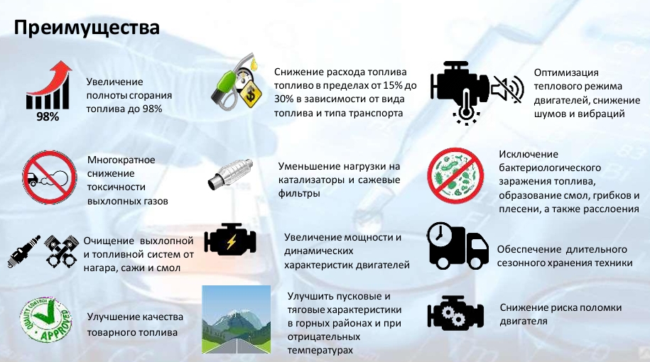 Изменения в динамике и приемистости ощутимы уже на «первом» выкатанном баке, так как возрастает полнота сгорания топлива и динамические характеристики. Это касается новых авто и автомобилей которые заправляются топливом с низким содержанием серы. Автомобилям с серьёзным пробегом потребуется очистка нагара и окалин в камере сгорания. Это займёт некоторое время, а само топливо будет постоянной мягкой промывкой. Поэтому изначально почувствуется увеличение мощности двигателя и снижение шумности – последствия ликвидации «калильного зажигания» и удаления нагара. Далее очередь дойдет до экономии топлива. Здесь всё также как у человека, который принял слабительное средство. Процесс очистки от шлаков не приятен, но это временно. В среднем это занимает 4 выкатанных топливных бака или 2 000 — 3 000
