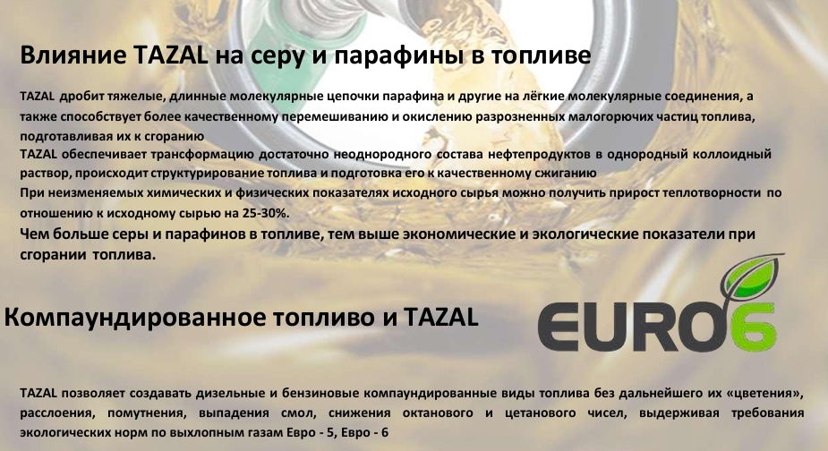 Обработка топлива добавкой «TAZAL» приводит к равномерному распространению цепной реакции окисления углеводородных цепочек в топливной смеси и снижает вероятность возникновения зон резкого тепловыделения. Это приводит к стабилизации уровня температуры в области движения поршня. По причине отсутствия температурных всплесков повышается инертность азота к окислительным процессам, а окисление углеводородов уменьшает выброс углерода, оксида углерода СО, несгоревших углеводородов СН, оксидов азота NOx, оксидов серы SO2 и других газов. В выхлопной системе бензиновых двигателей образуется вода, которая является главным признаком полного сгорания топлива согласно упрощённой формуле полного сгорания углеводородного топлива СН + О2 = СО2 + Н2О. Благодаря этому ресурс каталитических преобразователей и сажевых фильтров увеличивается на 50 – 100