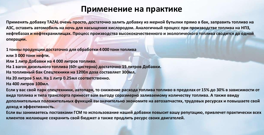 Добавку применять экономически выгодно. Регулярное использование «TAZAL» позволит экономить на горюче-смазочных и расходных материалах, увеличит ресурс двигателя, продлит срок службы каталитических нейтрализаторов, угольных фильтров, форсунок.