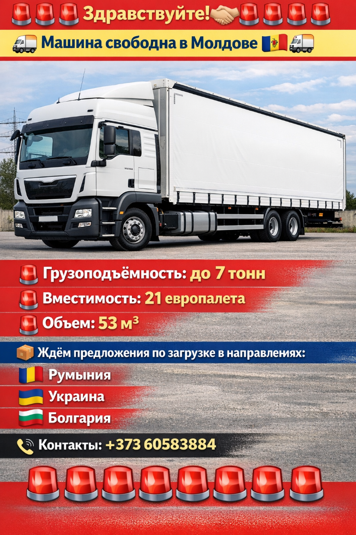 🚨🚨🚨🚨🚨🚨🚨🚨 Bună ziua! 🤝 🚚 Mașină disponibilă în Moldova 🇲🇩 🚨 Capacitate de încărcare: până la 7 tone 🚨 Capacitate: 21 europaleți 🚨 Volum: 53 m³ DORESC FOTO 📦 Așteptăm propuneri de încărcare în direcțiile: 🇷🇴 România 🇺🇦 Ucraina 🇧🇬 Bulgaria ☎️ Contact: +373 605 83884 🚨🚨🚨🚨🚨🚨🚨🚨