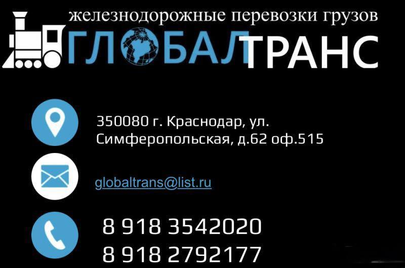 ООО «Глобал Транс»350080 г. Краснодар, ул. Симферопольская, д. 62, оф. 515офис +7 (861) 210-97-50 офис +7 (918) 210-98-50 моб. +7 (918) 279-21-77 Пелихов Роман моб. +7 (918) 354-20-20 Цветков Алексей globaltrans@list.ru