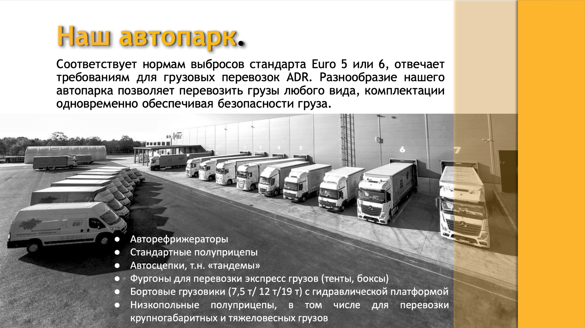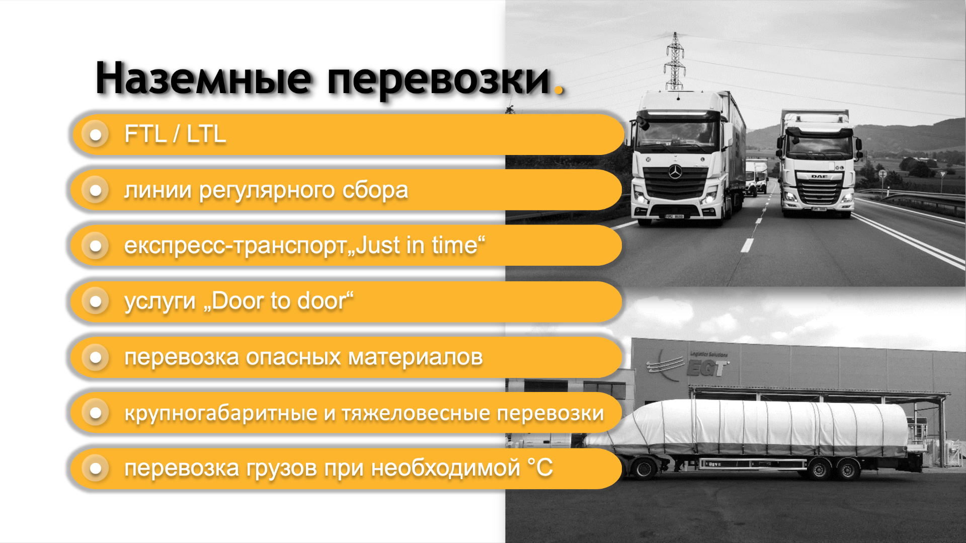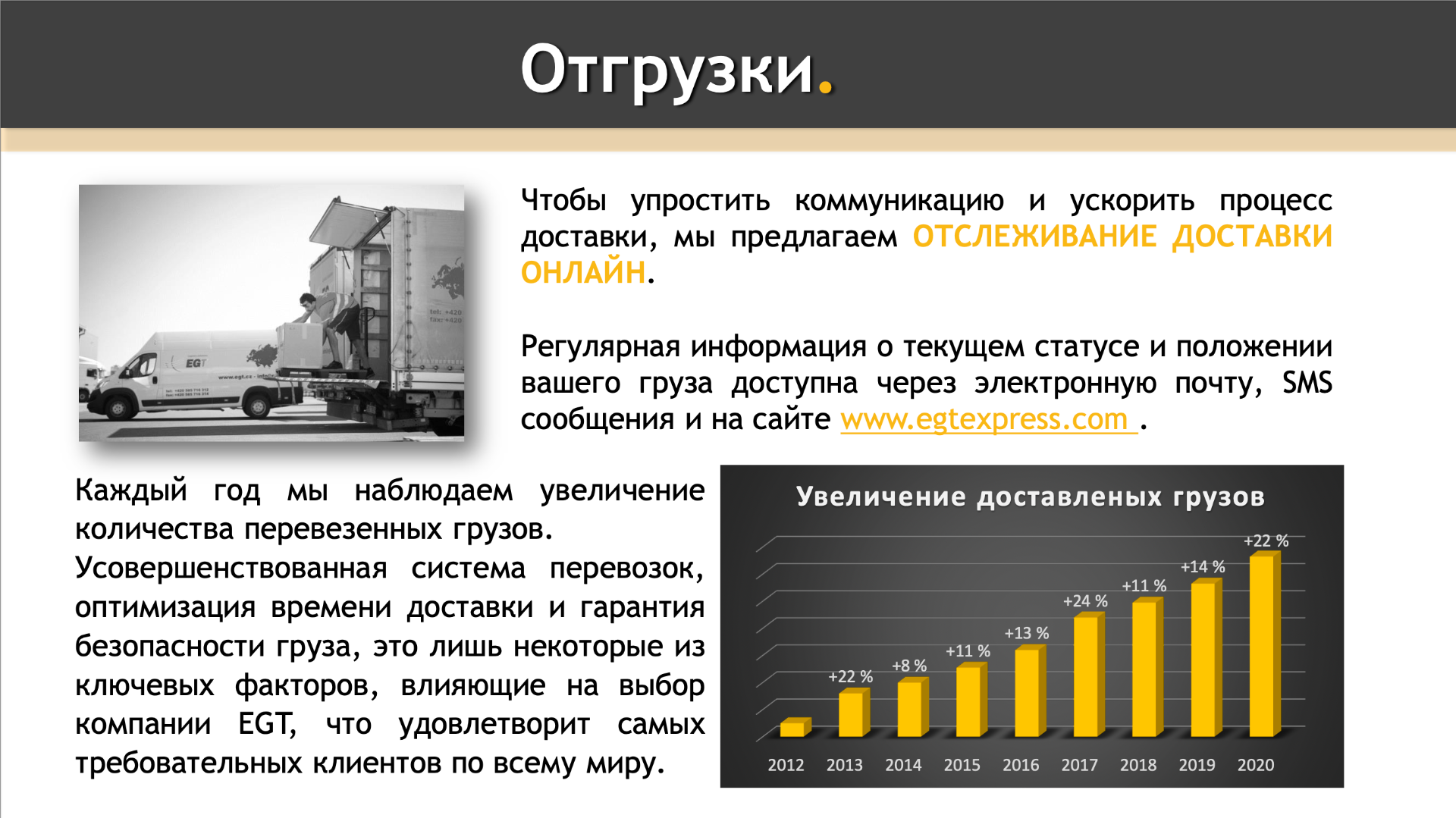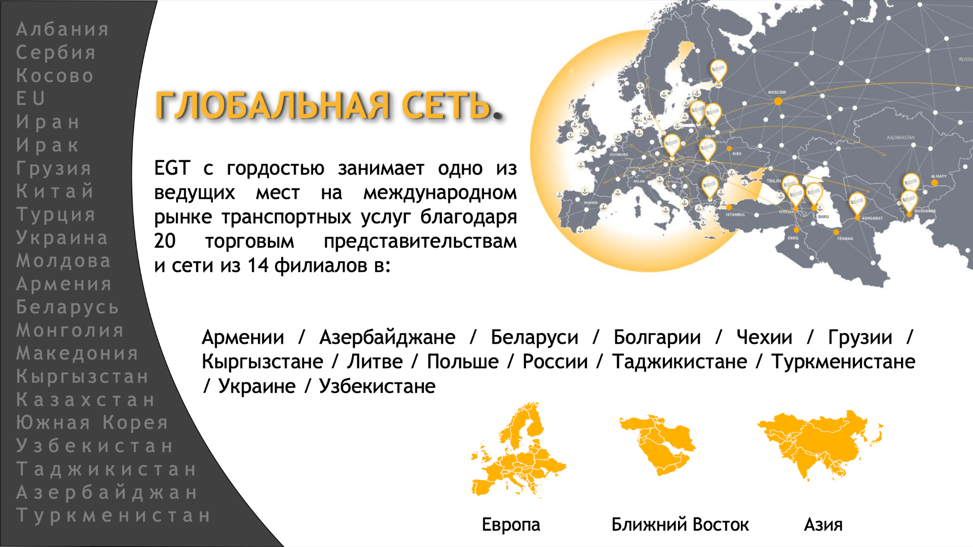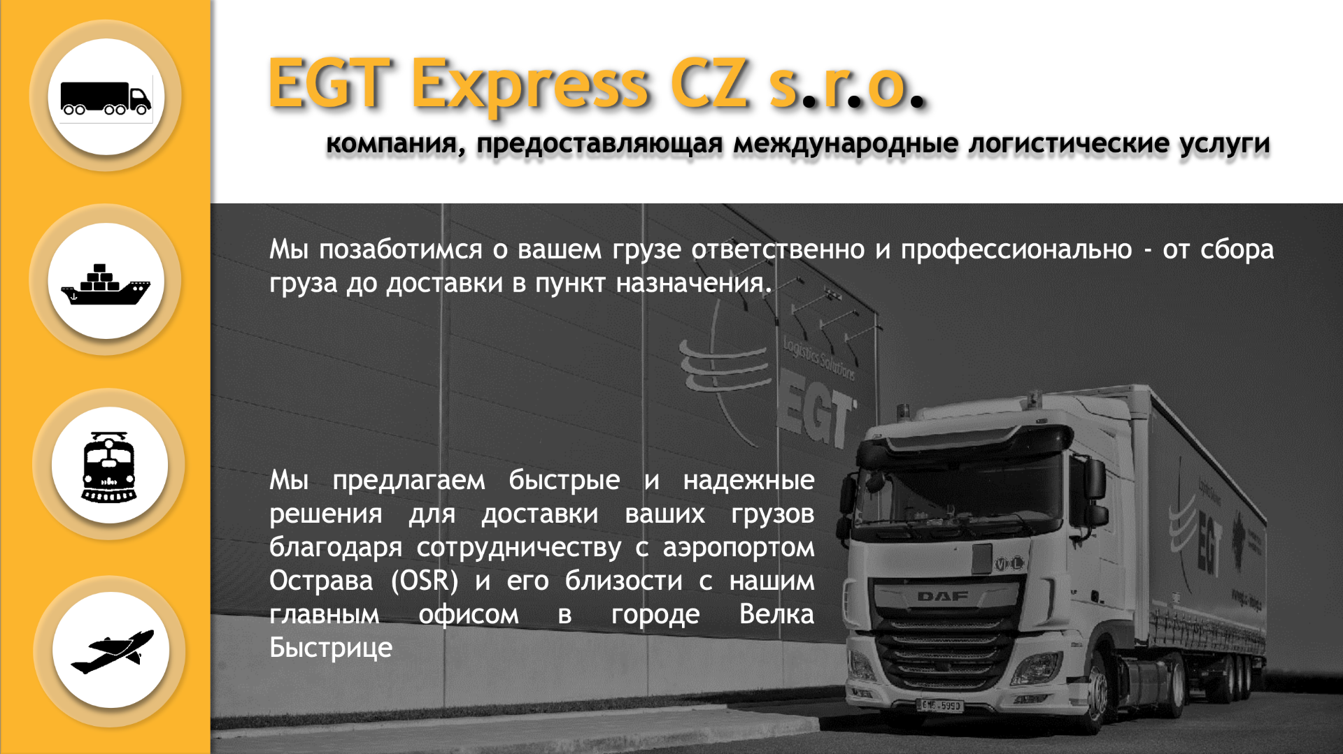 Компания EGT Экспресс предлагает услуги международных грузовых перевозок. Посредством широкой сети филиалов в странах Восточной Европы и