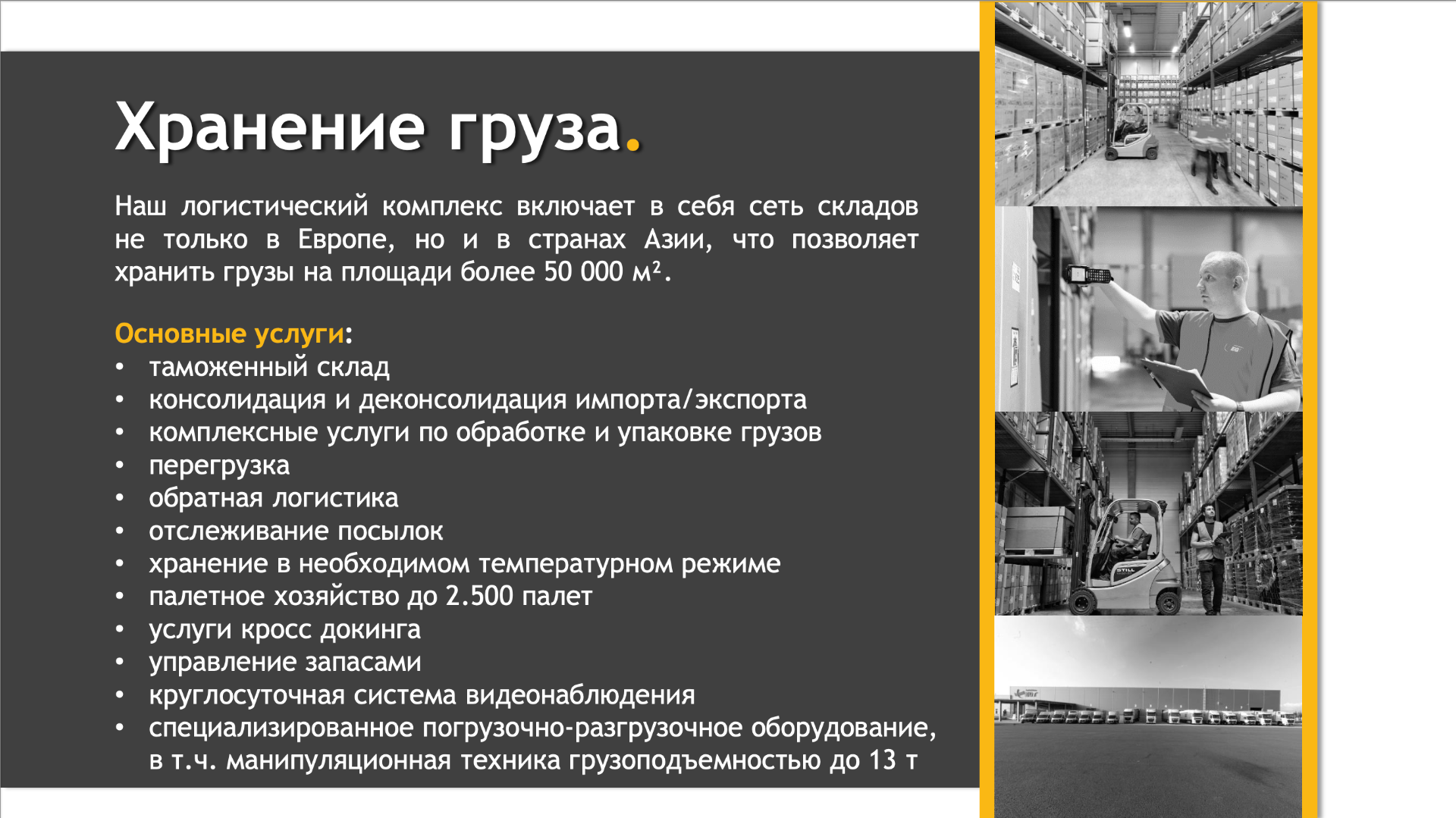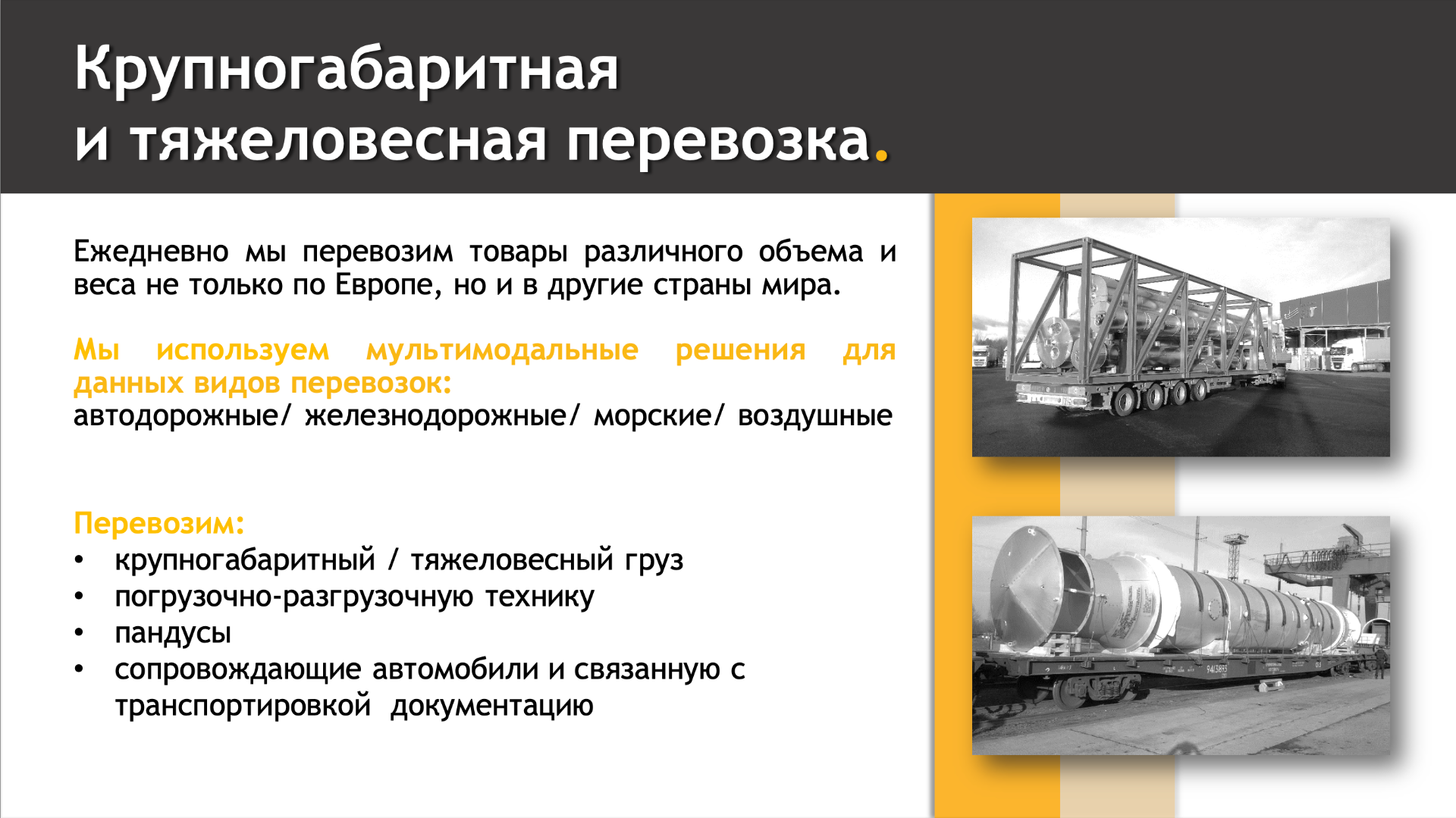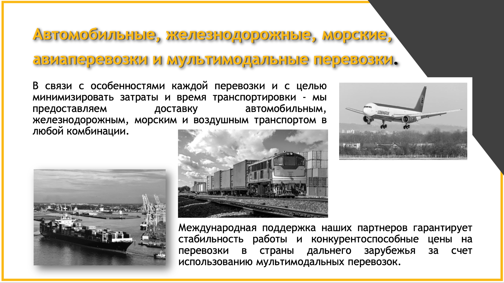 Наше основное внимание сосредоточено на наземных транспортных перевозках штучных и оптовых грузов в страны СНГ, Монголию и страны Ближнего Востока. Список обслуживаемых направлений постепенно расширяется.